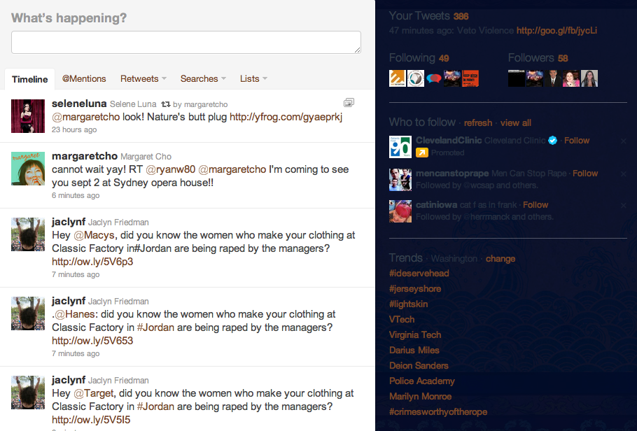 Okay, now that it’s just us, I need to ask you–where are you guys? I see you all over Facebook, but out there on Twitter, you’re nowhere to be found. Do you know how much amazing information is sent out into the universe via 140 characters? Do you know that our advocate colleagues have a serious presence on Twitter? Collaboration and interdisciplinary education no longer just happen in person. In fact, much of it is happening less and less in person and more through social media than ever before. Some of the best info I get comes from folks like @ORSATF, @PreventConnect, and so on. And all the good stuff that so many of you email to tell me you love about FHO? There’s even more of it on Twitter. That’s where I send out information on region-specific trainings, great news articles and much, much more. See that button to the right of this post, just under the Subscribe via Email? That’s all you have to click on to follow @ForensicHealth (that’s me) right now.