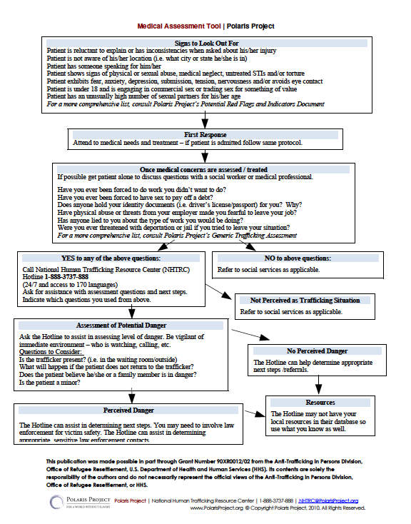 If you haven’t perused the Polaris site, wander on over, because aside from the module, there are some excellent tools for clinicians. Not only do they have a comprehensive assessment tool, they have a nice one-page algorithm for assessing potential trafficking patients (and who among us doesn’t love a good algorithm?). Perfect for posting in your Emergency Department or distributing at the next staff meeting: